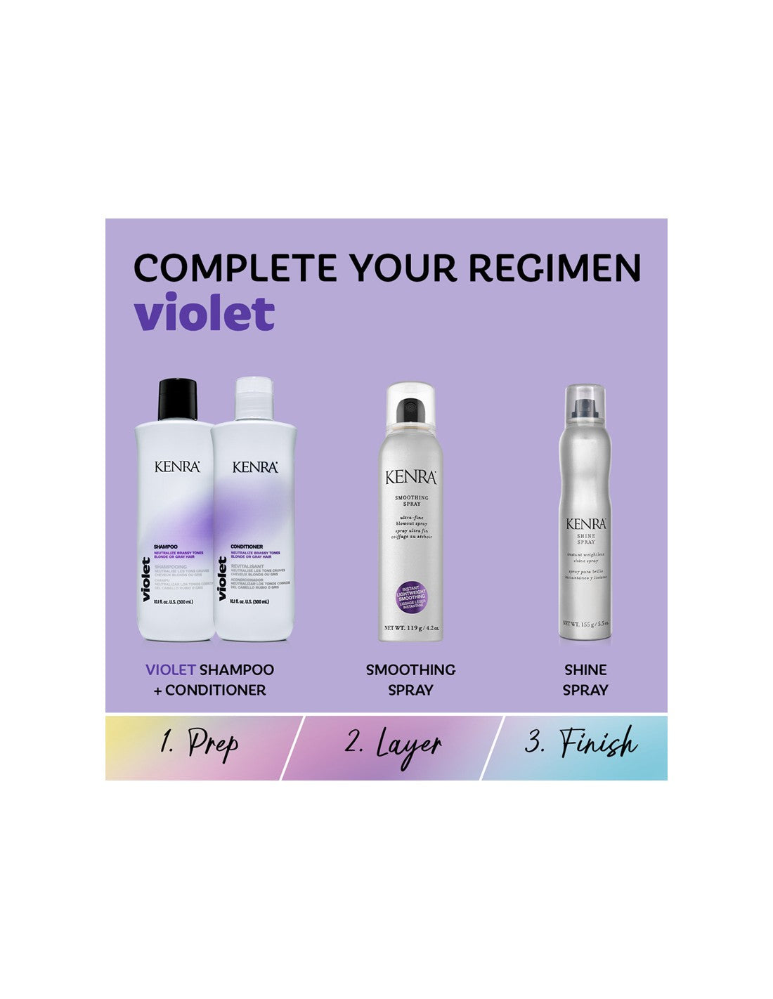 Enhance the vibrancy of blonde or gray hair and eliminate brassy tones with the Kenra® Violet system. The Violet Shampoo and Conditioner tone and neutralize yellow between salon visits. This system makes hair more manageable, adds radiance, and leaves dull, processed hair feeling moisturized.
