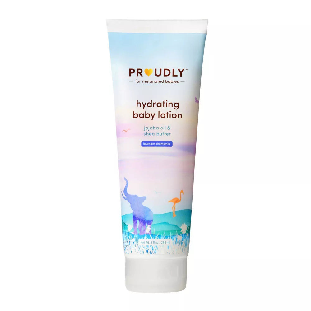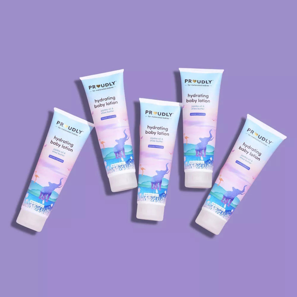 The PROUDLY Hydrating Baby Lotion in Lavender Chamomile is a go-to moisturizer for melanated babies. Replenishing jojoba oil moisturizes while hydrating shea butter deeply nourishes thirsty skin. It's lightweight and non-greasy for everyday application. The lavender chamomile scent is natural and gentle at less than 1% concentration to calm your littlest love (and you!) before bedtime or naptime.
